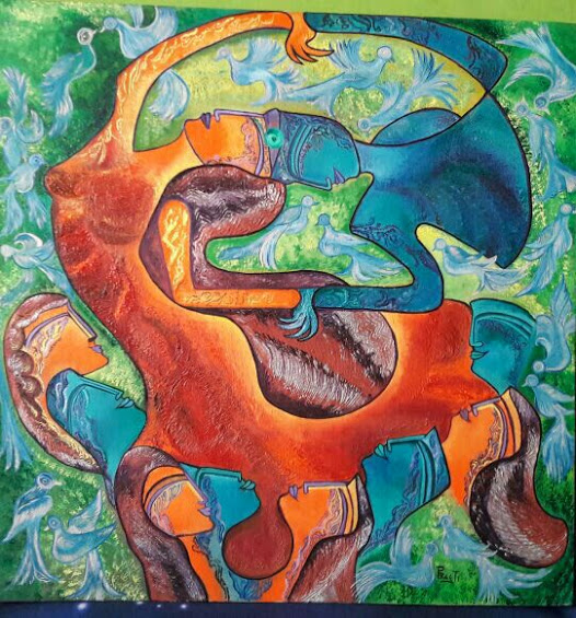 Artist have main area of interest lies in paiting flocks of birds from united together in different agles sort of creating a mirror image of the birds with intrinsic splash of colours