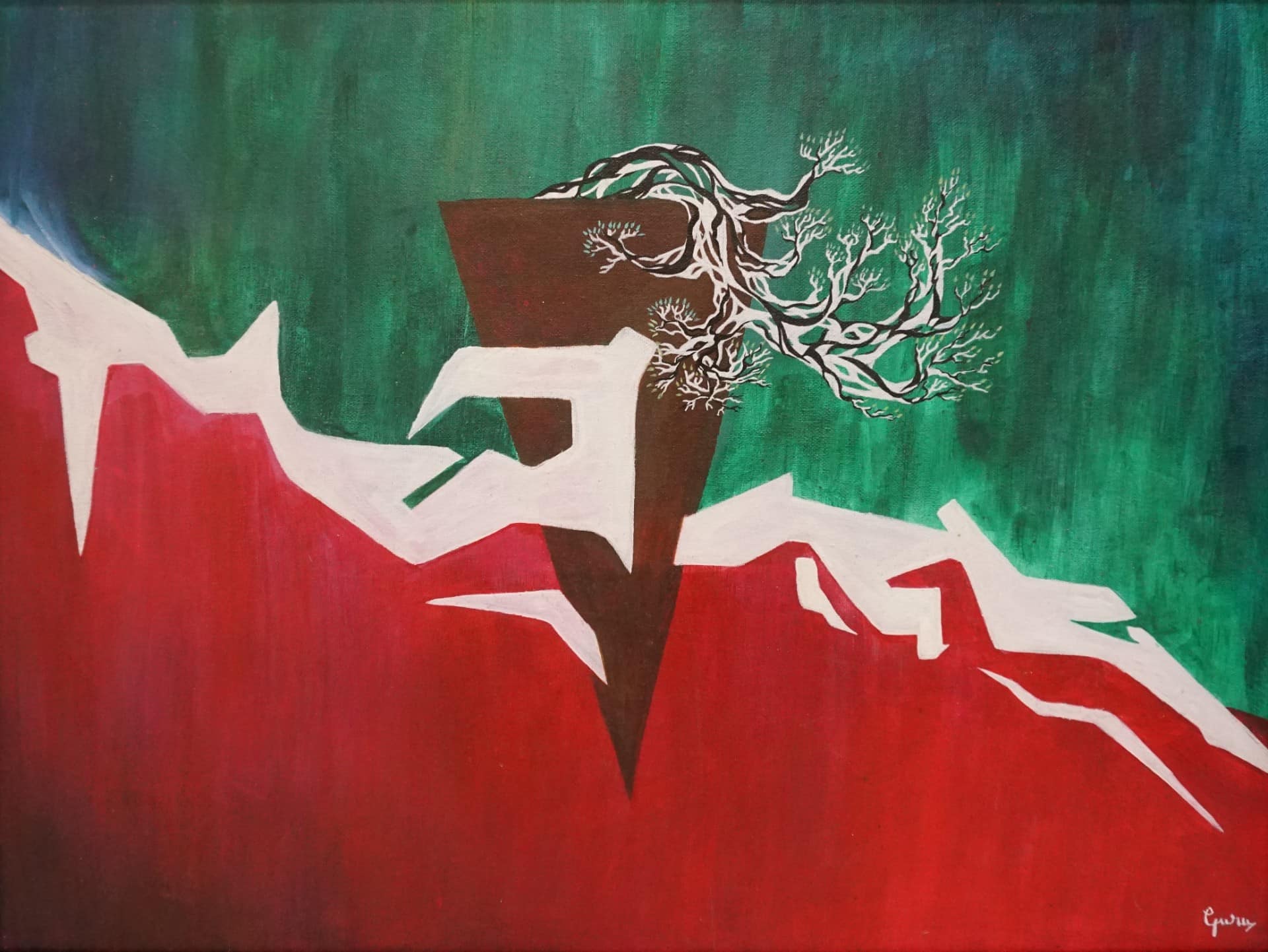 An abstract with red and green as the two aspects of Life which looks contradictory but bear a Tree of Life where everything is complementary.