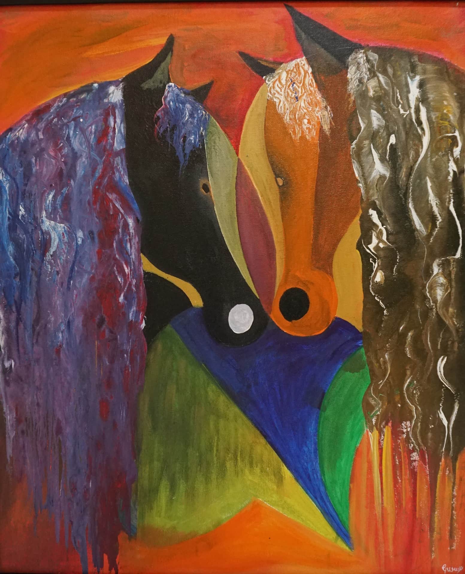 This is an abstract with vibrant colors . A tender expression of Love is what the peice of work is, an overlapping of their heads show a delicate intimacy.