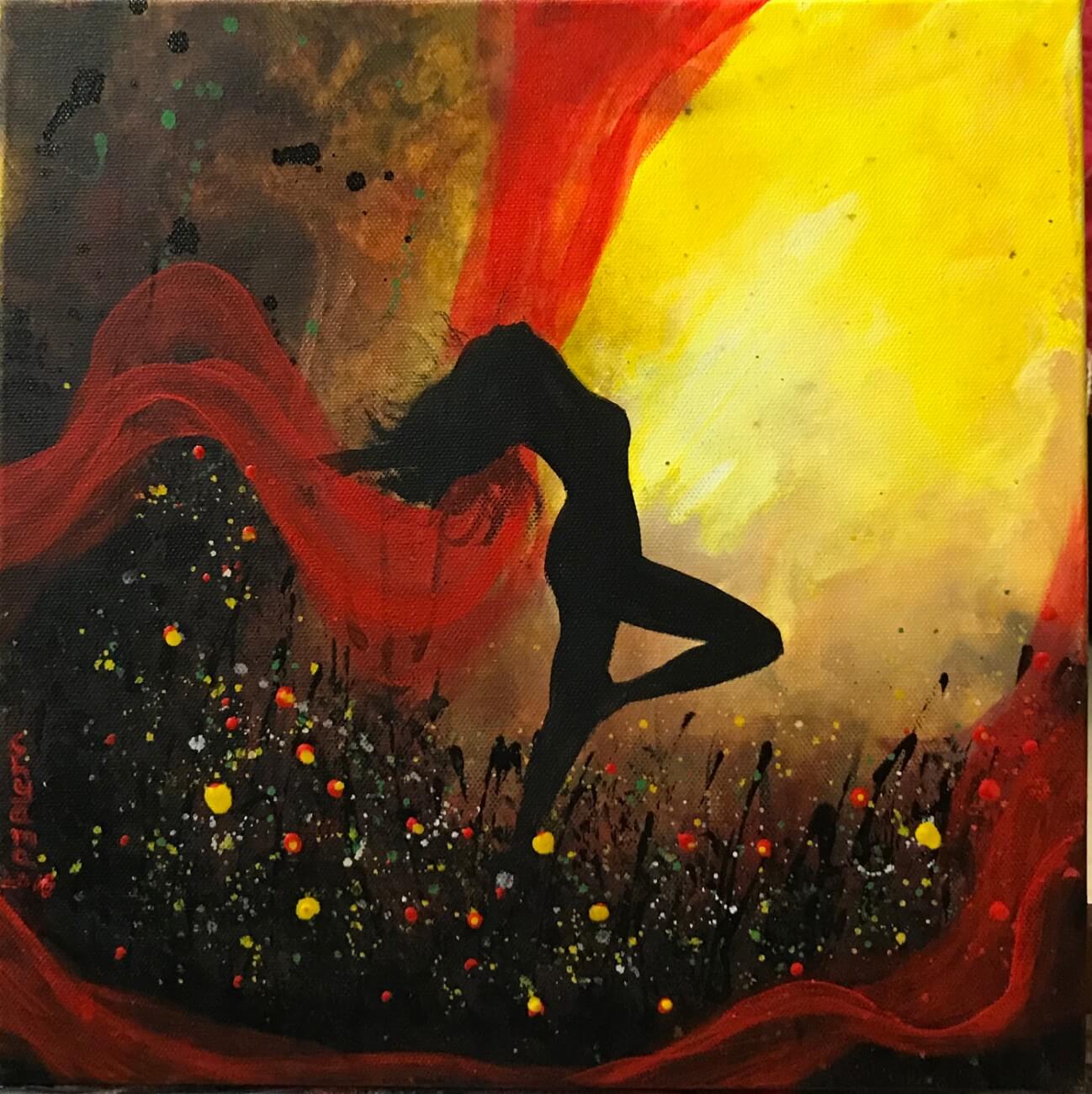 Artist work mainly involves beautiful and delicate dancing Ladies signifying freedom and passion. Usually her choice of colours are restircted to 2-3 mix of shades.