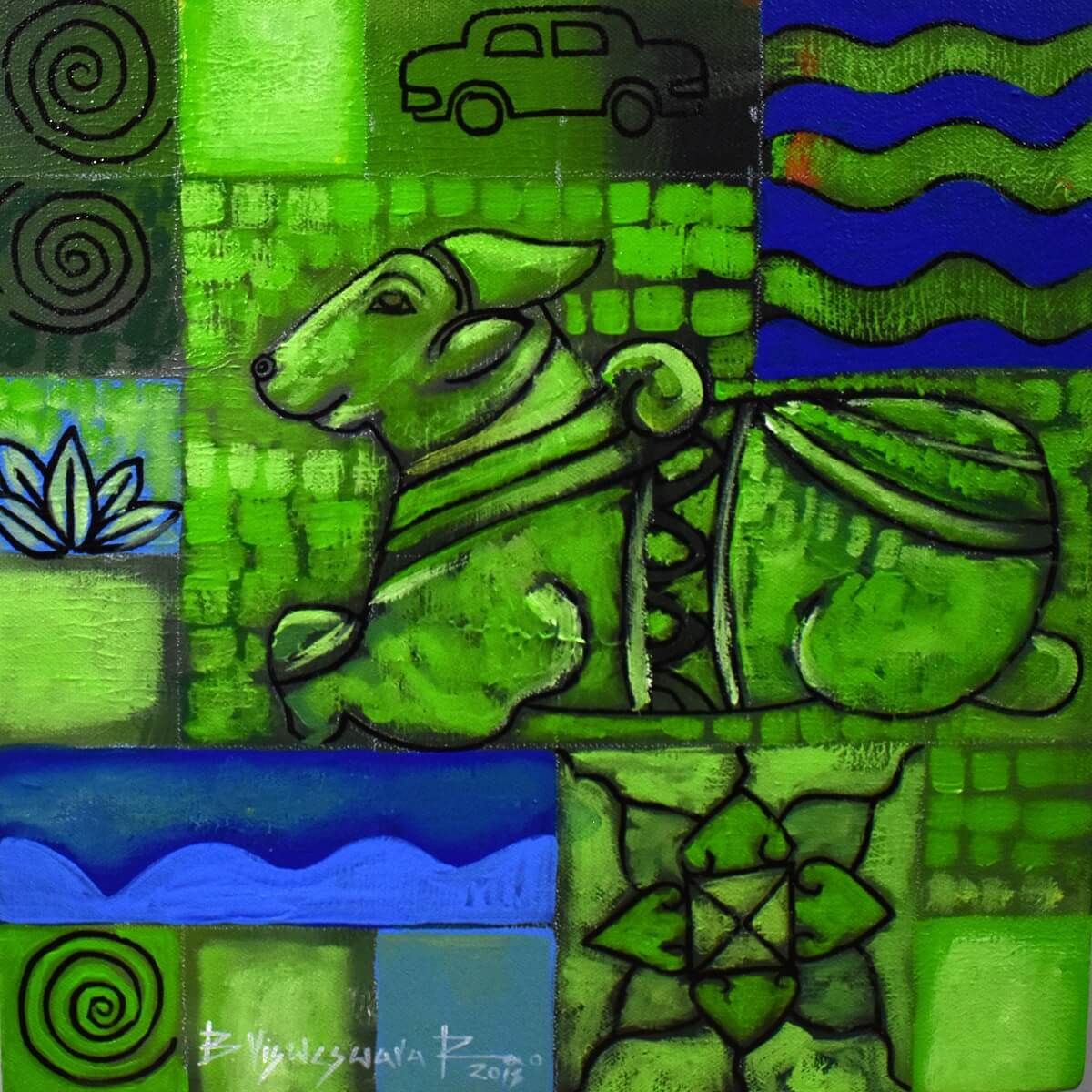 Artist paintings consists of lot of squares which are painted with many of images like flowers, traditional motifs, Intricate symmetrical as well as asymmetrical patterns and Textures, colours and line plays major role in the composition of painting. Viewer can connect with myth, realityy and spiritual knowledge. Lotus can be seen many times in his style of painting which resembles the seven Inner Chakras explained by patanjali as Ashtanga yoga marg, the 8 fold method to awaken the Kundalini.some of deity’s images. Tiny square spaces are what he prefers for his paintings since it is like an act of doodling on a sketchpad. These are executed in three dimensional texture and resemble the “psychedelic art”. Visual Impact of composition and colours reflects the awakening of inner spiritual thought process and also indicates the phantasms of mind. It clearly narrates his creative and dexterous journey.