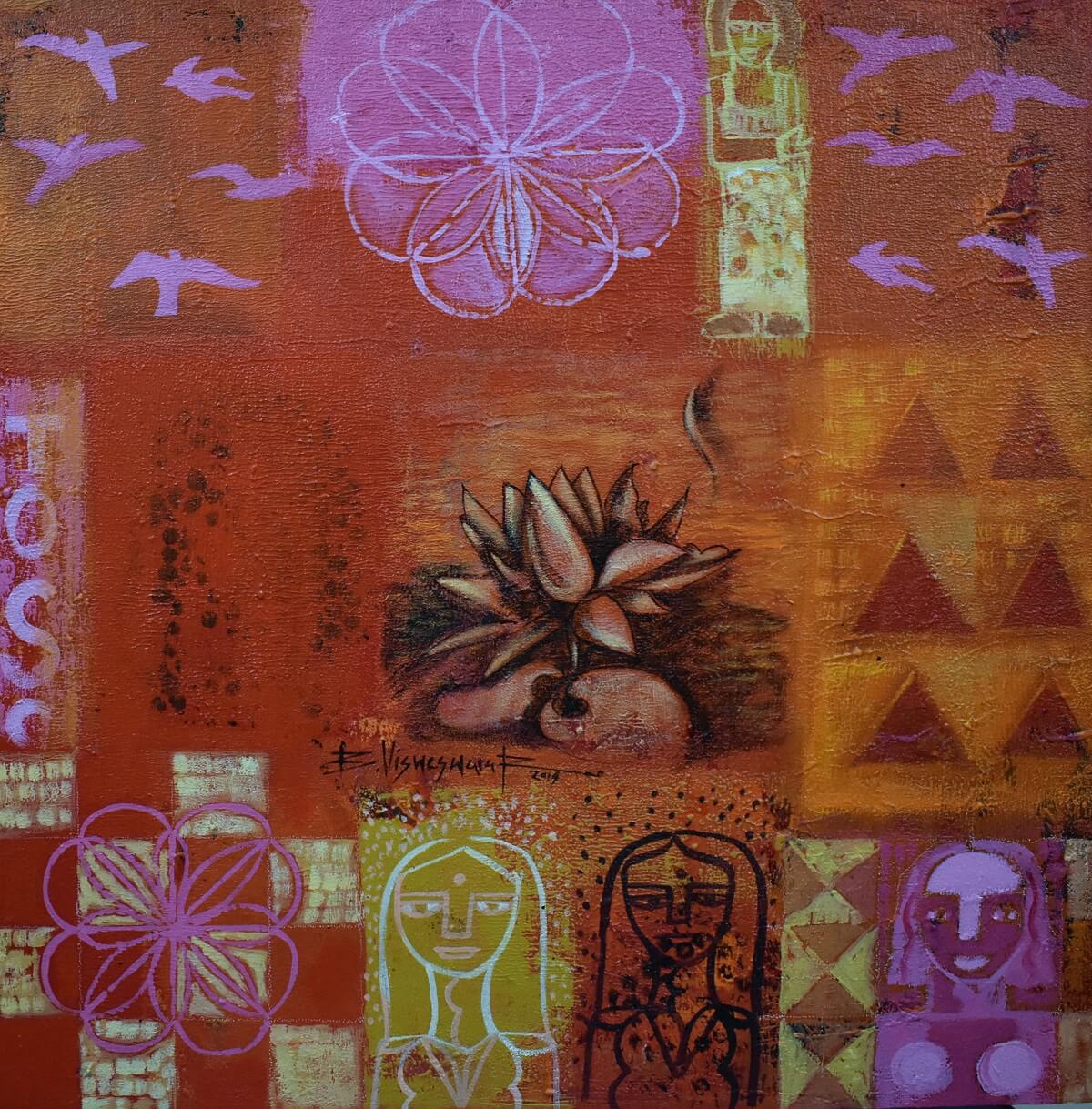 Artist paintings consists of lot of squares which are painted with many of images like flowers, traditional motifs, Intricate symmetrical as well as asymmetrical patterns and Textures, colours and line plays major role in the composition of painting. Viewer can connect with myth, realityy and spiritual knowledge. Lotus can be seen many times in his style of painting which resembles the seven Inner Chakras explained by patanjali as Ashtanga yoga marg, the 8 fold method to awaken the Kundalini.some of deity’s images. Tiny square spaces are what he prefers for his paintings since it is like an act of doodling on a sketchpad. These are executed in three dimensional texture and resemble the “psychedelic art”. Visual Impact of composition and colours reflects the awakening of inner spiritual thought process and also indicates the phantasms of mind. It clearly narrates his creative and dexterous journey.