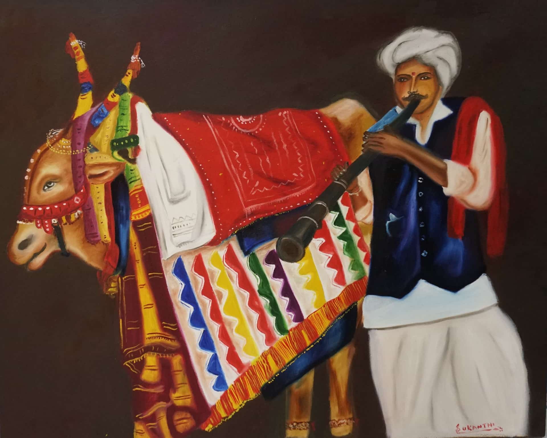 Artist experiments on varied subject of interest ranging from the scenic trees, mountains to Hindu Gods, to Buddha, to women and what not. She likes to use the mix and match of colours (espcially bright colours) to make the overall output a pleasing effect to the eyes.