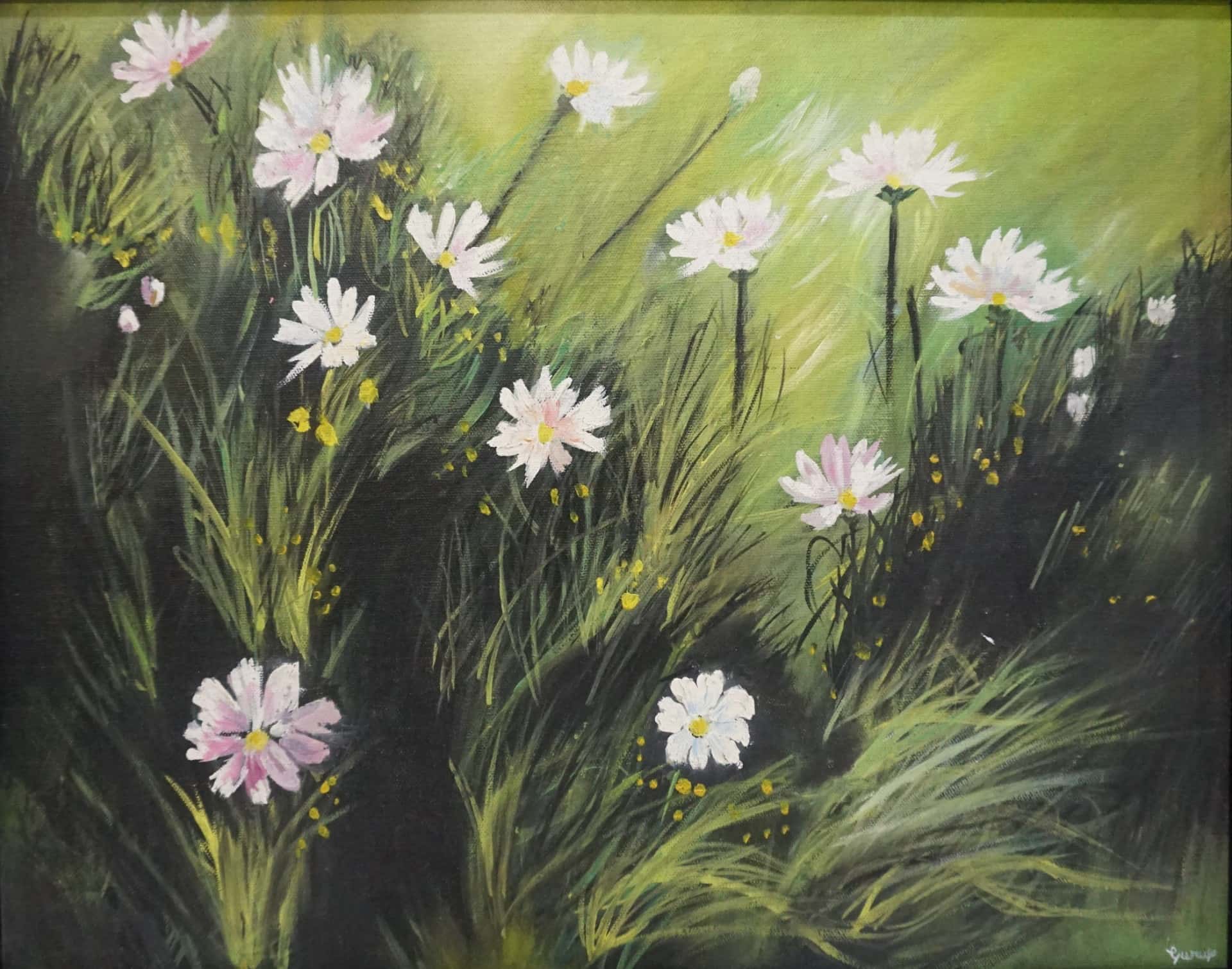 An Oil Painting of spring time flowers in bloom, the green background enriches and projects the flowers in an unlike sense.