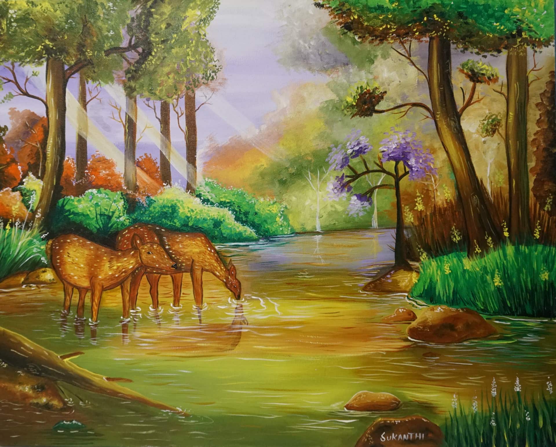 Artist experiments on varied subject of interest ranging from the scenic trees, mountains to Hindu Gods, to Buddha, to women and what not. She like to use the mix and match of colours (espcially bright colours) to make the overall output a pleasing effect to the eyes.