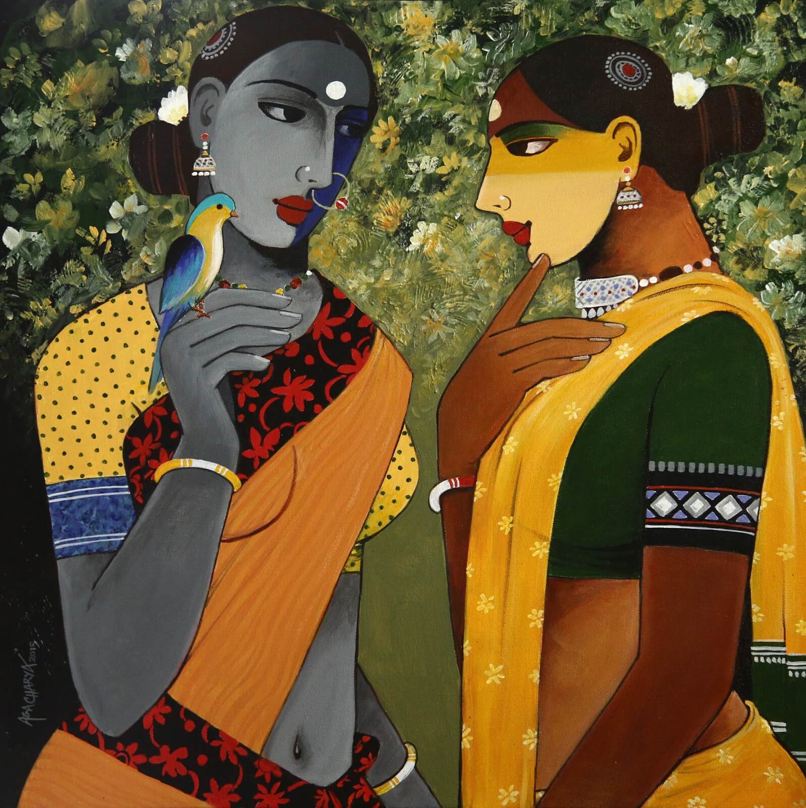 Artist main subject is women who in turn reflect the nature. A backdrop of rural women and their emotions- Innocence, affection, purity, sentiments towards their festivals and celebration of the village are inspirations and subject of the artist to portray the reality in a village setting