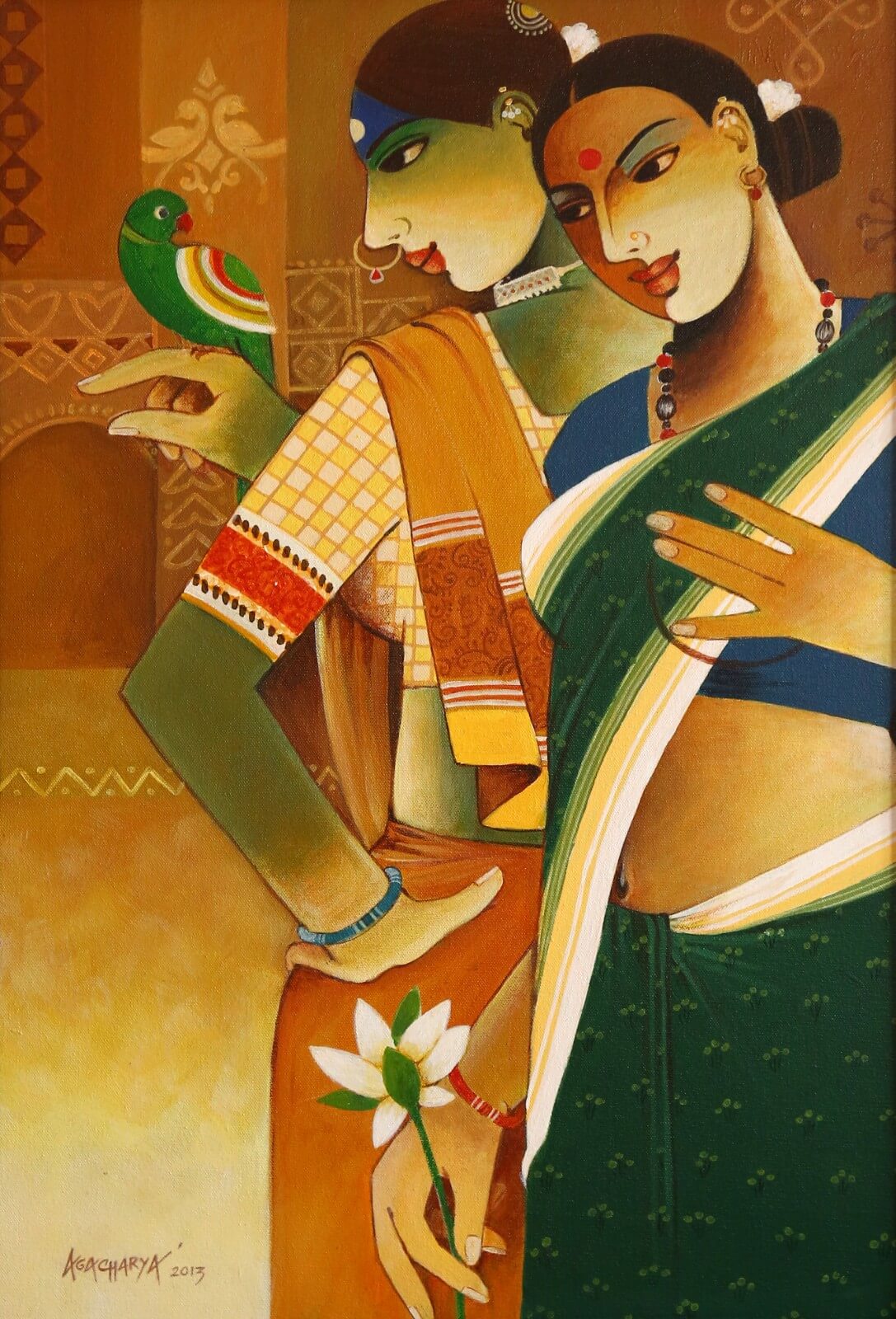 Artist main subject is women who in turn reflect the nature. A backdrop of rural women and their emotions- Innocence, affection, purity, sentiments towards their festivals and celebration of the village are inspirations and subject of the artist to portray the reality in a village setting