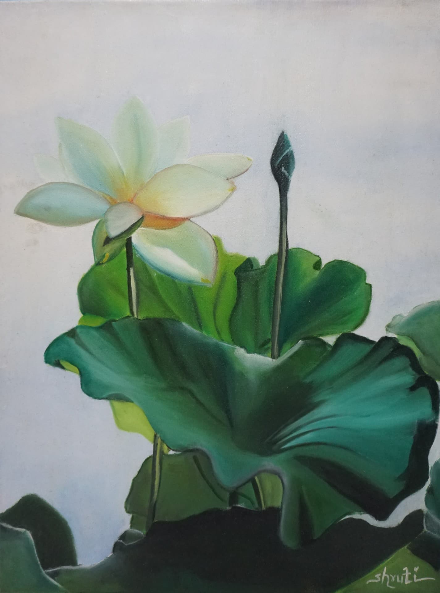 The painting depicts how the white lotus resonates tranqulity.