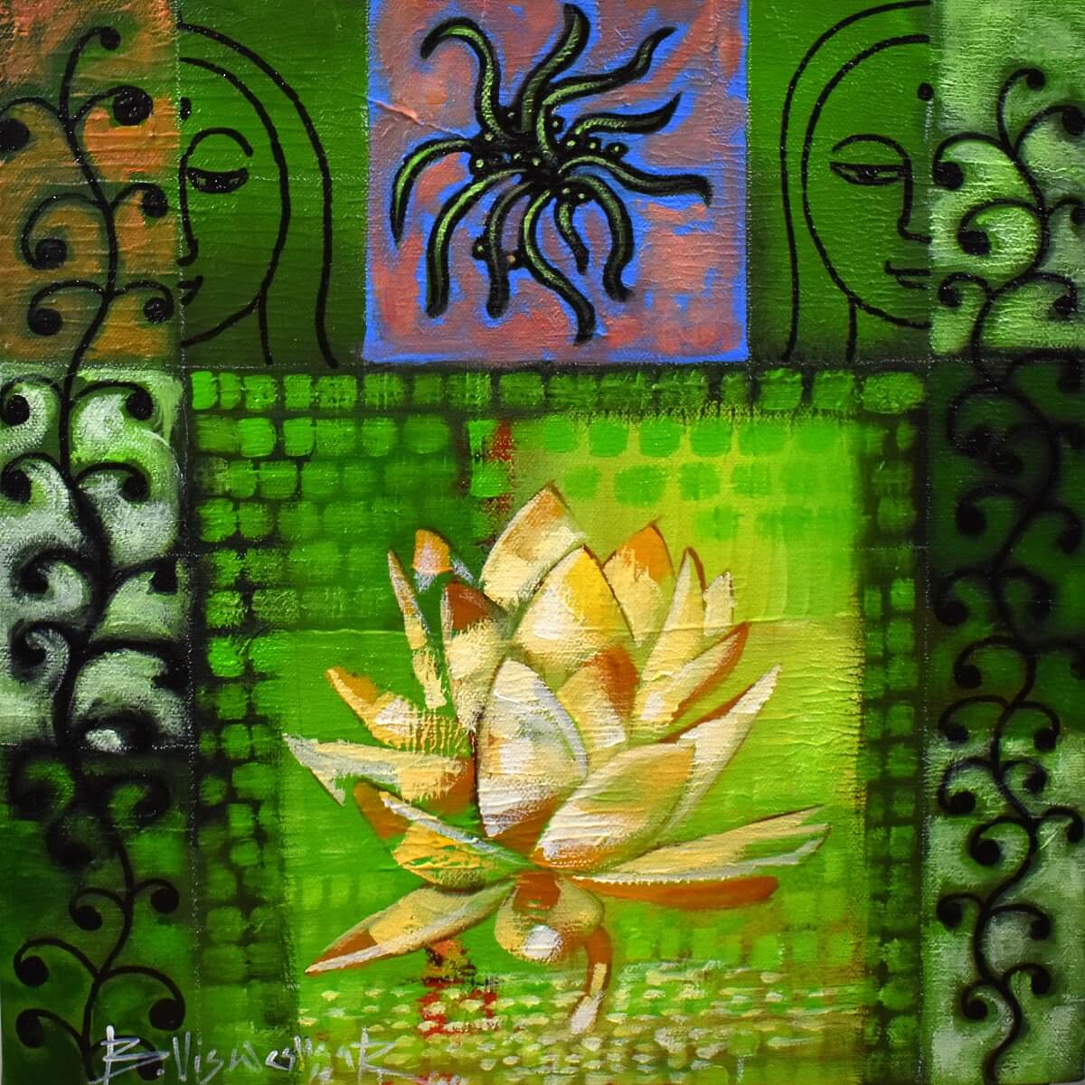Textures, colours and line plays major role in the composition of painting. Viewer can connect with myth, realityy and spiritual knowledge. Lotus can be seen many times in his style of painting which resembles the seven Inner Chakras explained by patanjali as Ashtanga yoga marg, the 8 fold method to awaken the Kundalini.